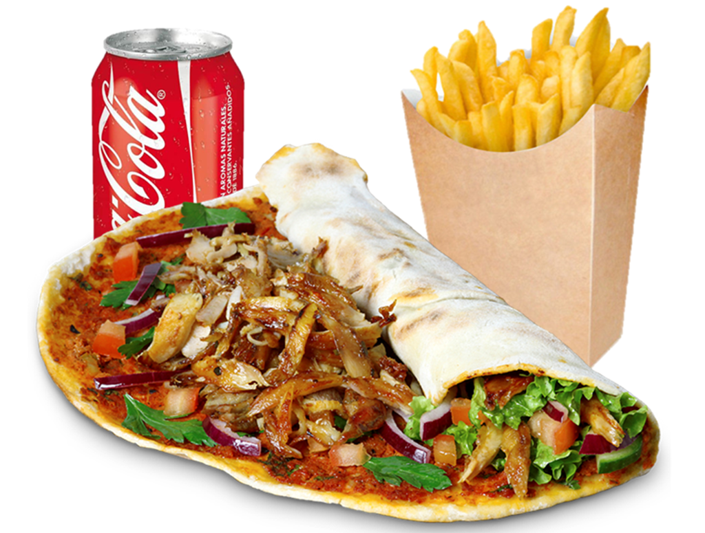 PIZZA TURCA. PIZZA ENROLLADA CON UNA FINA SABROSA CAPA DE CARNE,TERNERA, POLLO O MIXTO ,LECHUGA,TOMATE Y LAS SALSAS
